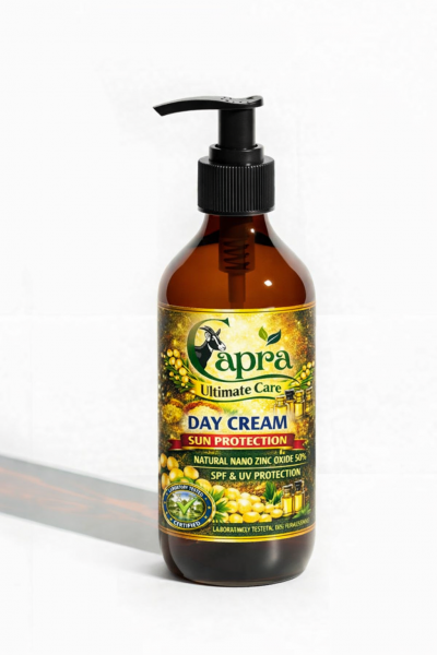 Description: A protective day cream enriched with goat milk and natural oils, boosted with nano zinc oxide (50%) for mineral-based sun protection. Hydrates while shielding skin from UV exposure.